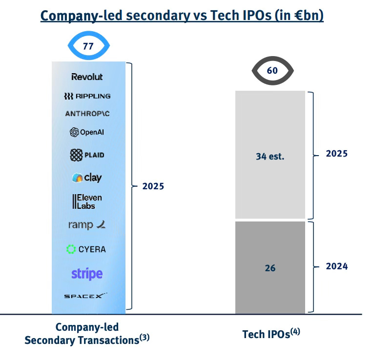 In 2025, company-led secondary transaction volume reached $77bn globally, up from $60bn the prior year — and for the first time, meaningfully surpassing Tech IPO volumes. This is not a temporary aberration. It is the product of deep structural shifts in how companies grow, how talent expects to be rewarded, and how institutional capital seeks exposure to private innovation.