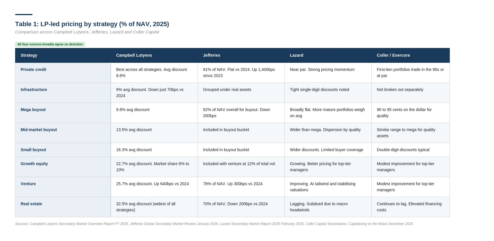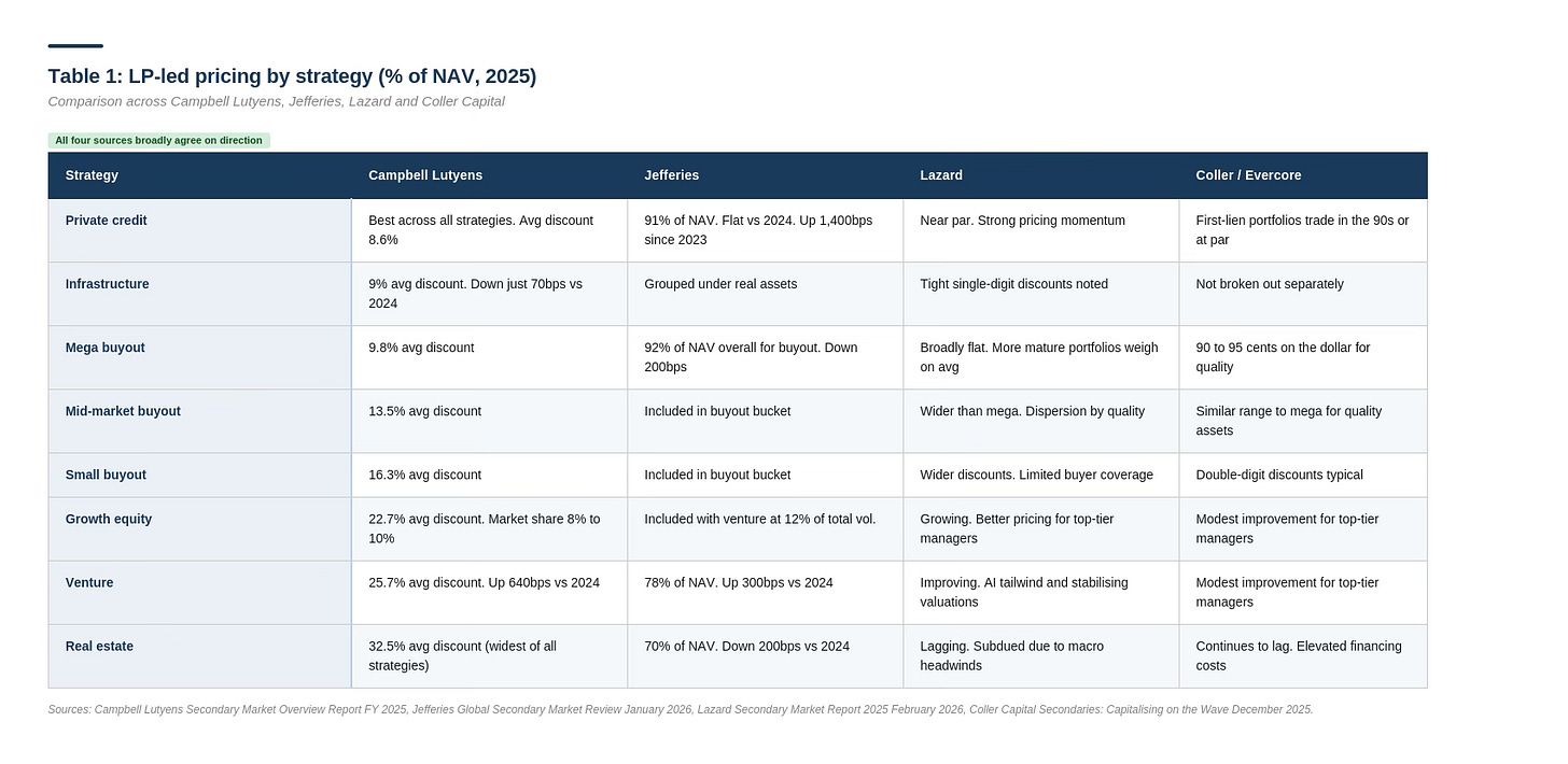 Venture and growth equity saw the biggest positive movement. Campbell Lutyens records a 640 basis point improvement. Jefferies records 300 basis points. The numbers differ because of how they weight the underlying transactions, but the direction is consistent. The stabilisation of tech valuations and the AI momentum in 2025 helped narrow bid-ask spreads, particularly for top-tier managers where secondary buyers now have more confidence in terminal valuations.