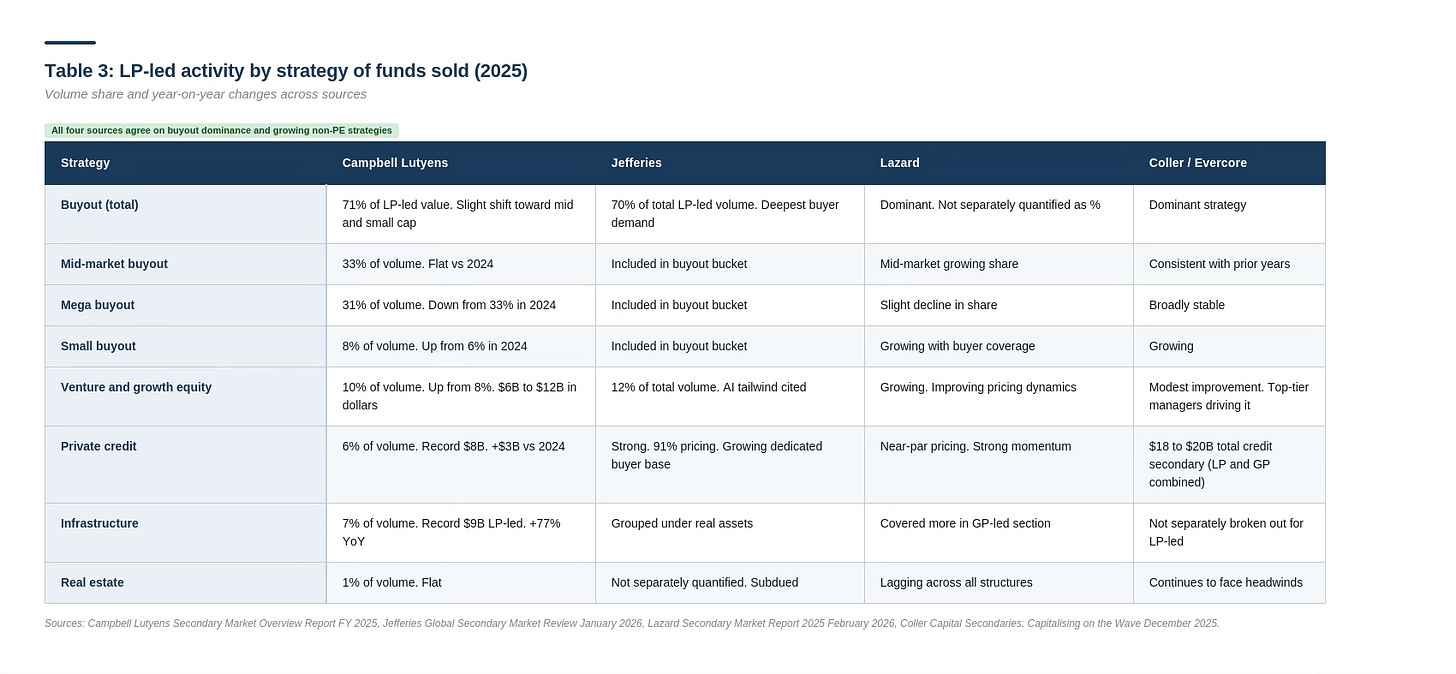 Buyout funds dominated LP-led volume in 2025, accounting for roughly 70 to 71 percent of total value across all four sources. Within buyout, there was a shift toward mid-market and small-cap, which Campbell Lutyens attributes to increased buyer coverage of those segments. Jefferies confirms the buyout dominance.