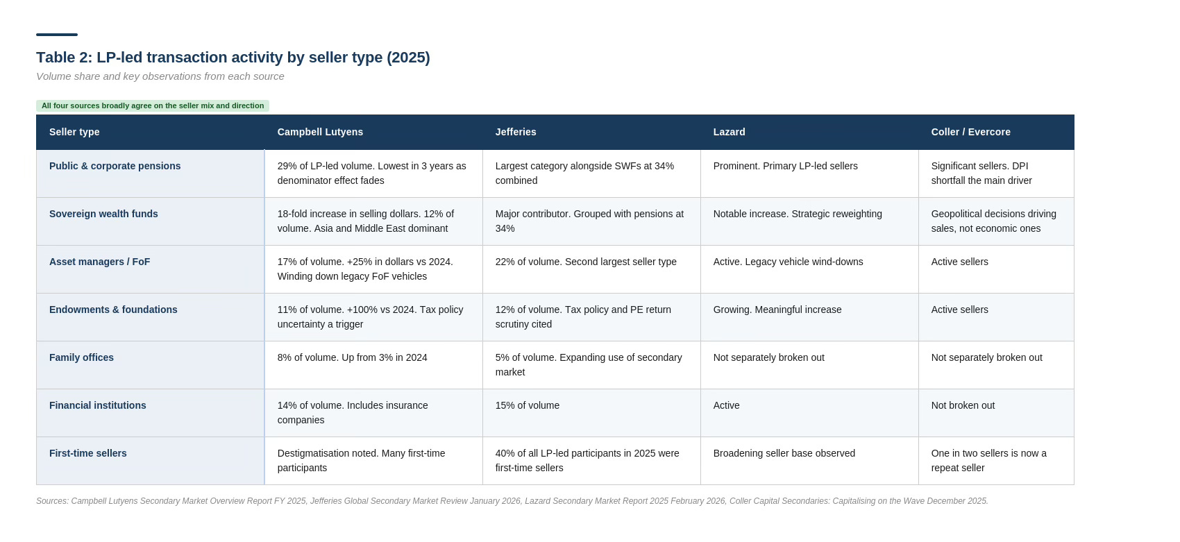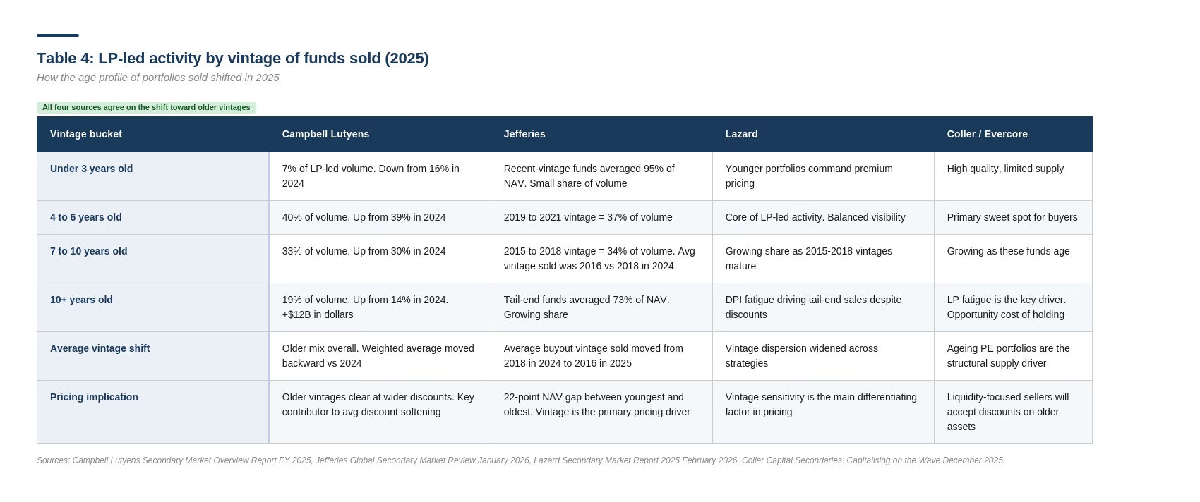LP-led is now a mainstream portfolio management tool. The destigmatisation is essentially complete. Half or more of sellers in 2025 had done it before. The market is no longer driven by distress or forced sales. It is driven by rational decisions about opportunity cost, overallocation and liquidity needs.