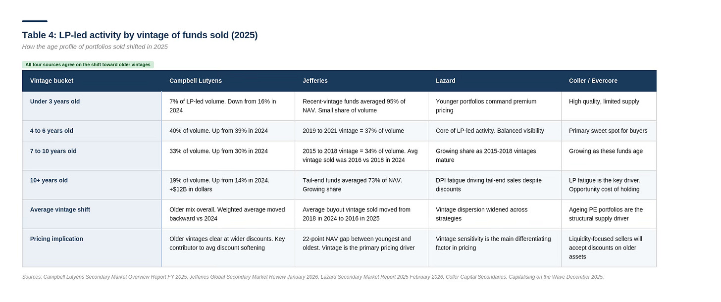 The vintage shift also explains part of the pricing softening. Tail-end funds clear at wider discounts because there is less upside, less time, and more limited buyer familiarity with the underlying portfolio companies.
