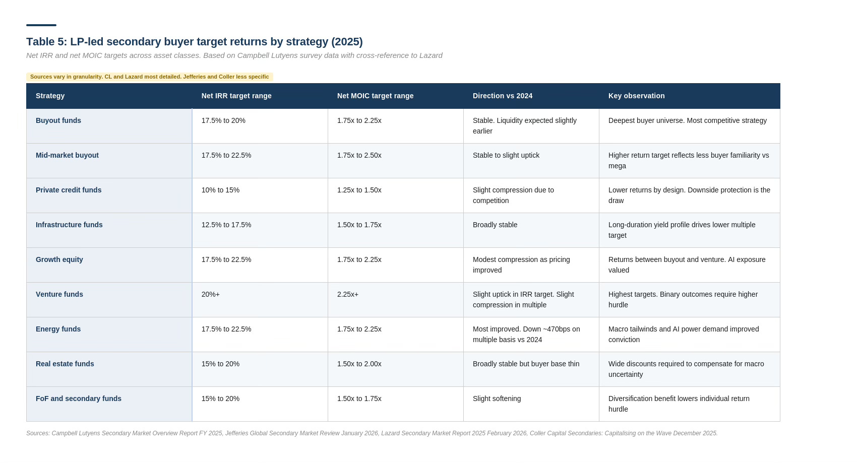 Secondary buyers in the LP-led market are not all targeting the same return. The profile varies significantly by strategy, and the reports give a consistent picture of that dispersion even if the precise numbers differ by methodology.