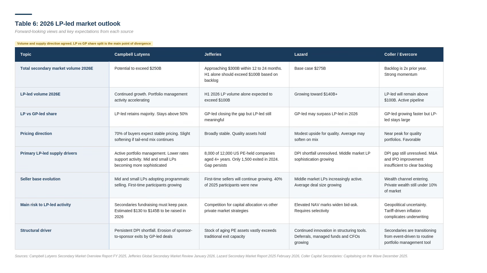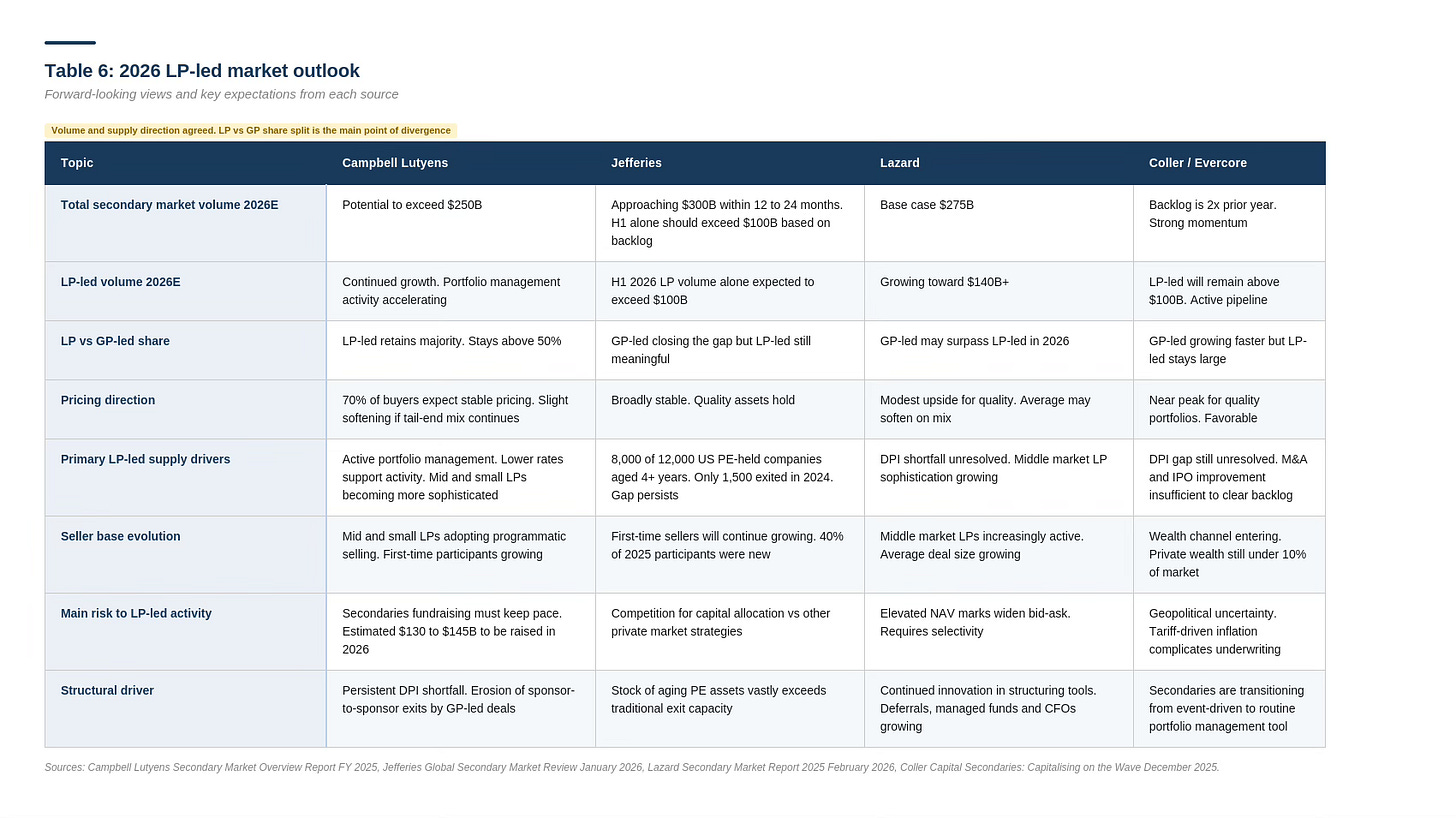 All four sources expect LP-led volumes to grow further in 2026. The specific numbers vary. Campbell Lutyens expects the overall secondary market to exceed $250 billion, with LP-led volume continuing to grow as a structural component. Jefferies sees line of sight to total market volume approaching $300 billion within 12 to 24 months, with H1 2026 alone expected to exceed $100 billion based on deal backlog. Lazard forecasts $275 billion for the overall market. Coller cites a backlog significantly higher than the prior year as supporting evidence for continued momentum.